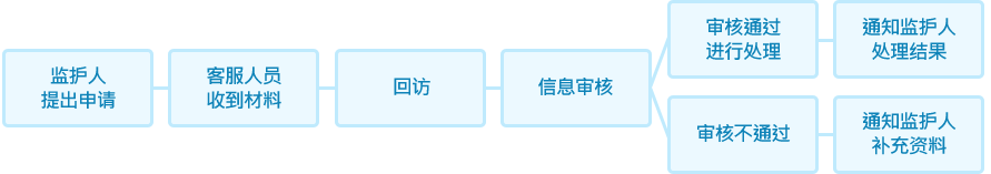 您提交相关申请资料后,我司客服人员将按照监护申请流程尽快处理您的申请,处理过程中可能需要对监护人和被监护人进行电话回访以便信息的判定,希望您的配合。